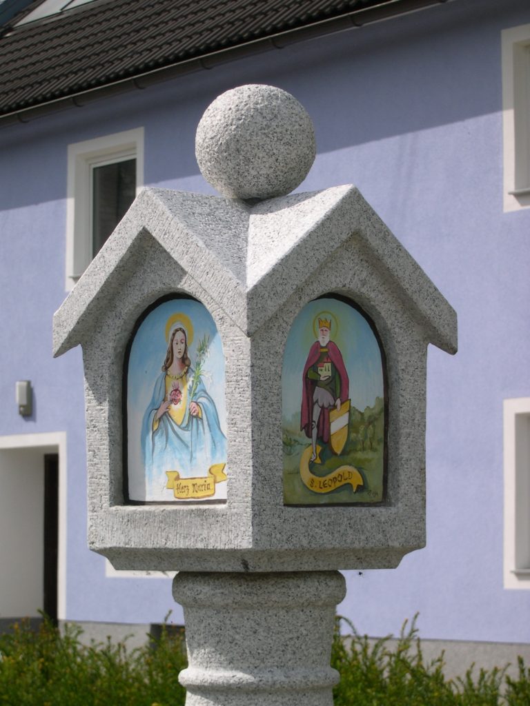 Der Heilige Leopold, ursprünglich Leopold III aus dem Haus der Babenberger, wurde 1485 von Papst Innozenz heilig gesprochen. Er ist Gründer der Klöster Klosterneuburg, Heiligenkreuz und Klein-Mariazell sowie Landespatron von Österreich. Sein Gedenktag wird am 15. November gefeiert. Dargestellt wird er mit weißem Bart in Rüstung, mit Krone, Mantel und Schild sowie ein Kloster in seinen Händen.