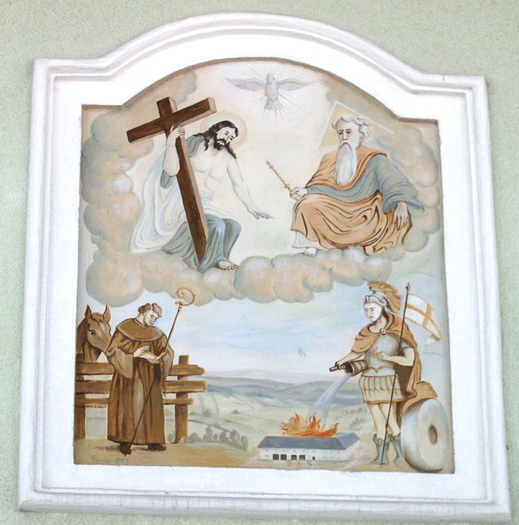 Der heilige Florian (rechts) ist Schutzpatron der Feuerwehr, einer der populärsten Heiligen und seit 2004 Landespatron von Oberösterreich. Dargestellt wird Florian als römischer Legionär mit Fahne, Wasserkübel, brennendem Haus sowie einem Mühlstein. Am Haus soll er vor Bränden schutzen.