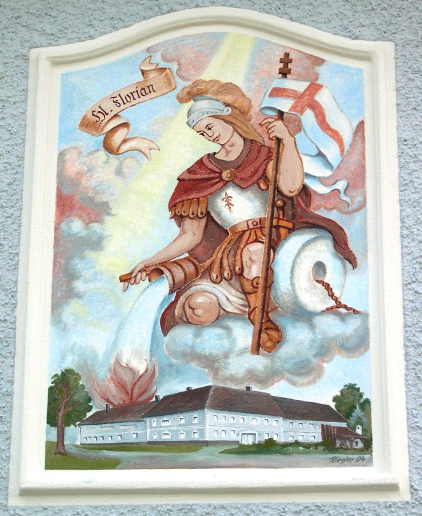 Der heilige Florian ist Schutzpatron der Feuerwehr und wird sowohl in der katholischen als auch in der orthodoxen Kirche gleichermaßen verehrt. Der heilige Florian ist einer der populärsten Heiligen und seit 2004 Landespatron von Oberösterreich. Dargestellt wird Florian als römischer Legionär mit Fahne, Wasserkübel, brennendem Haus sowie einem Mühlstein. Auf vielen Bauernhäusern ziert der Heilige Florian die Fassade uns soll vor Bränden schützen.